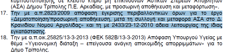 «Επίσης η προσβαλλόμενη απόφαση είναι συμβατή και με την ΚΥΑ 17206/1873/14/3/13(ΦΕΚ 597/ Β) η οποία εκδόθηκε λόγω της επείγουσας ανάγκης αποκομιδής απορριμμάτων από το Δήμο Τρίπολης και το γεγονός του κορεσμού της εγκ/σης δεματοποίησης που εξυπηρετεί το Δήμο Ερμιονίδας η οποία προβλέπει ότι η Περιφέρεια Πελοποννήσου οφείλει να προβεί στις απαραίτητες ενέργειες στο πλαίσιο των αρμοδιοτήτων της προκειμένου να είναι δυνατή η θέση σε λειτουργία το ταχύτερο ,το αργότερο εντός 6μήνου,των υποδομών μεταβατικής διαχείρισης αστικών στερεών αποβλήτων που προβλέπονται στην ανωτέρω πράξη (βλ. το υπ΄ αρ. 70769/2849/4/12/13 έγγραφό της Δ/νσης ΠΕ. ΧΩ ΣΧ Πελοποννήσου)»