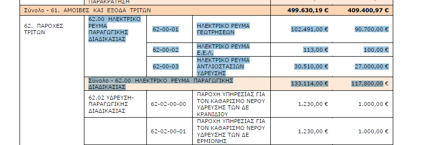Στον αντίστοιχο Προϋπολογισμό της ΔΕΥΑΕΡ  το κόστος του ηλεκτρικού ρεύματος που υπολογίζεται να καταναλωθεί για το 2015 είναι της τάξης των 117.000 ευρώ: