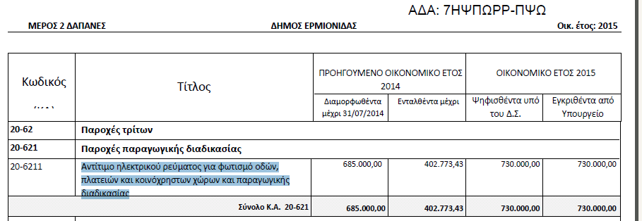 Όμως από τα στοιχεία του Προϋπολογισμού του Δήμου Ερμιονίδας για το 2015 φαίνεται ότι το συνολικό αντίτιμο του ηλεκτρικού ρεύματος που υπολογίζεται ότι θα καταναλωθεί  για το δημοτικό φωτισμό αλλά και αυτού της παραγωγικής διαδικασίας για το 2015 για όλο το Δήμο είναι της τάξης των 730.000 ευρώ: