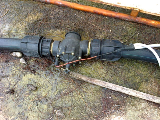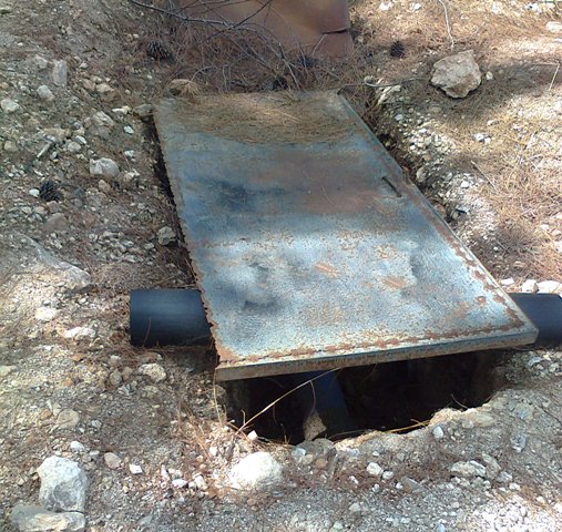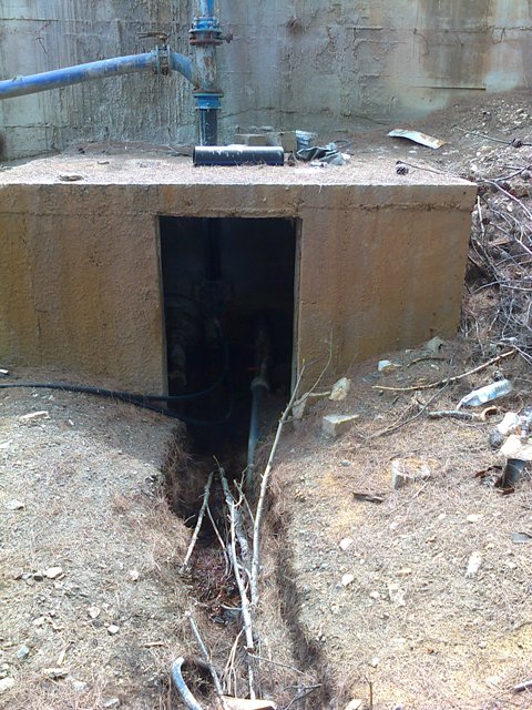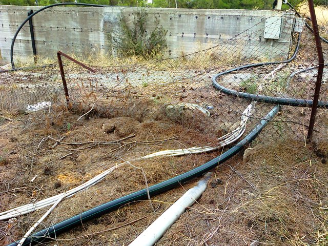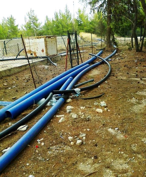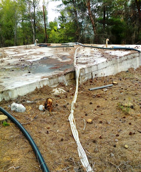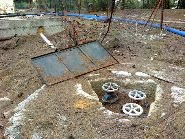 Στις παρακάτω φωτογραφίες που αποτελούν αδιάψευστο μάρτυρα διακρίνονται μεταξύ των άλλων ένας σωλήνας παροχής νερού να στηρίζεται από έναν τσιμεντόλιθο και το νέο κουτί με τις ασφάλειες( δεξιά) να είναι σκουριασμένο, ενώ στο κάτω μέρος φαίνονται τα καλώδια που πηγαίνουν στην άλλη δεξαμενή και είναι στην τύχη τοποθετημένα πάνω στο χώμα και τις πευκοβελόνες!!
