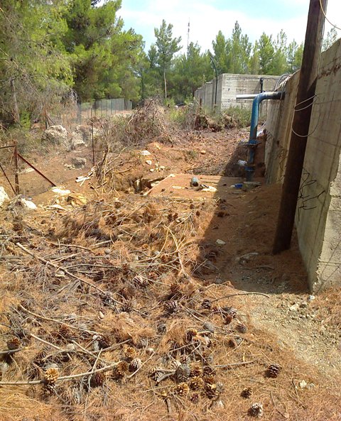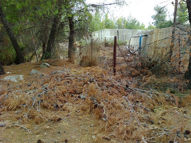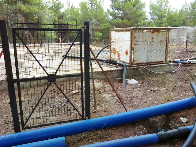 Παρακάτω διακρίνονται παρατημένοι σωλήνες,ανοικτό φρεάτιο με πρόχειρο σκουριασμένο καπάκι, τρύπες στο συρματόπλεγμα όπου ο καθένας μπορεί να μπει και να κάνει οτιδήποτε, ηλεκτροβάνα παρατημένη χωρίς κάλυμμα πάνω στη δεξαμένη, πολλά ξερά κλαδιά πεύκων και γενικά μια απαράδεκτη κατάσταση με τον κίνδυνο για φωτιά να είναι πολύ μεγάλος.