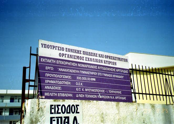 Όμως  η πινακίδα έξω από το Γυμναστήριο είναι αποκαλυπτική αφού το έργο έγινε με έκτακτη επιχορήγηση της Νομαρχιακής Αυτοδιοίκησης Αργολίδας μέσω ΟΣΚ (Οργανισμός Σχολικών κτιρίων) με προϋπολογισμό 300000 ευρώ :