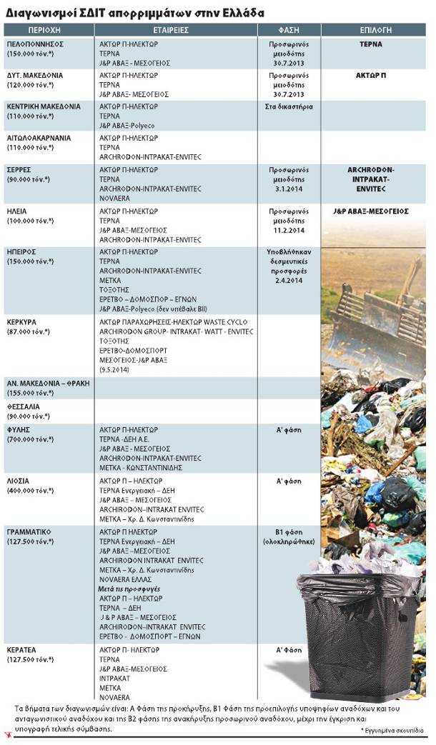 Πρωταγωνιστές που «μοιράζονται» το παιχνίδι των αναθέσεων είναι οι όμιλοι Λ. Μπόμπολα (Ακτωρ Ηλέκτωρ), Γ. Περιστέρη (ΤΕΡΝΑ-ΕΝΕΡΓΕΙΑΚΗ ΑΒΕΤΕ), Σ. Κόκκαλη (ΙΝΤΡΑΚΑΤ), Ιωάννου-Παρασκευαΐδη (J&Ρ ΑΒΑΞ) και Λασκαρίδη-Λάτση (Μεσόγειος) πλαισιωμένοι από μικρότερους, εγχώριες και ξένες εταιρείες. Η μεγάλη ανατροπή των έργων ΣΔΙΤ των σκουπιδιών είναι, σύμφωνα με έγκυρες πηγές, το «κολασμένο μυστικό», που προσπαθούν να διαφυλάξουν τις τελευταίες εβδομάδες τα συναρμόδια υπουργεία, οι περιφερειάρχες που είναι ξανά υποψήφιοι στην αναμέτρηση του Μαΐου και οι εμπλεκόμενοι εργολάβοι.